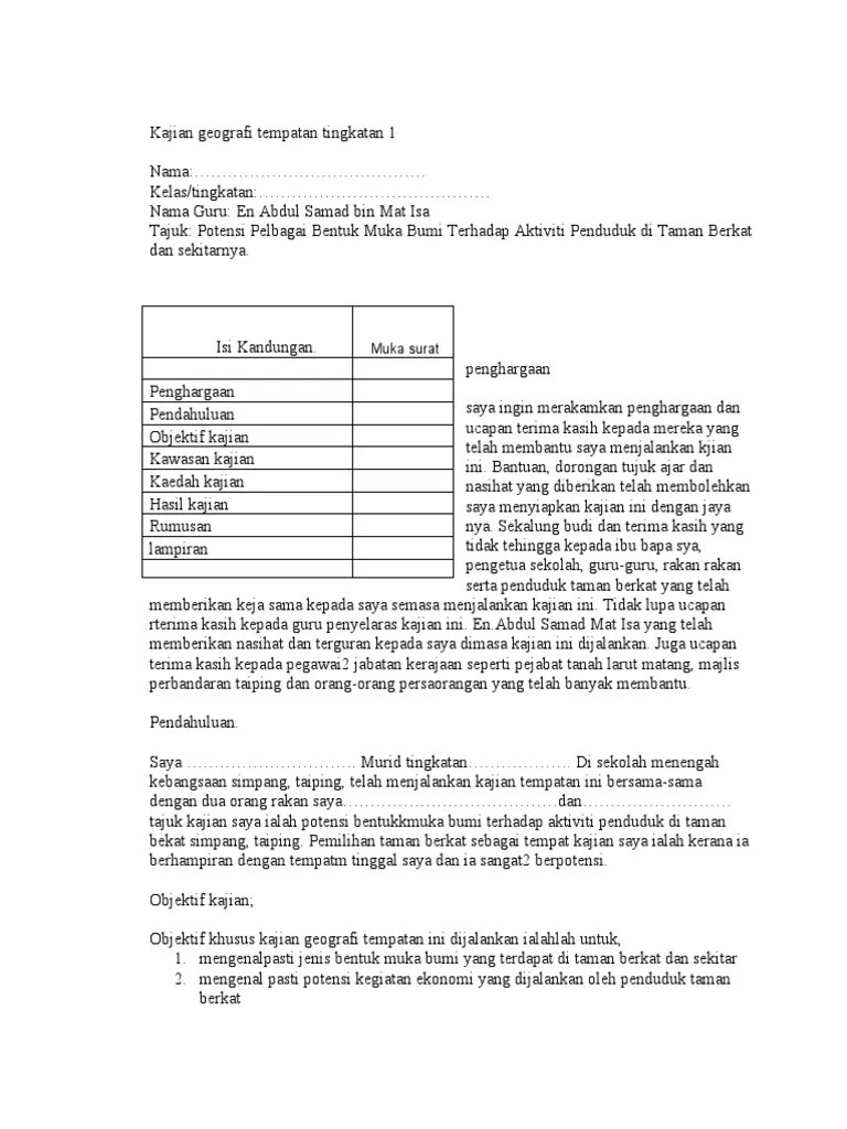 Kajian geografi tempatan tingkatan 1 nama:…. Konsep kajian merujuk buku teks tingkatan 1 konsep sisa . Pendahuluan saya telah menjalankan kerja kursus geografi tingkatan 1 yang bertajuk kajian lapangan tentang "sisa domestik" di kawasan (a) menghuraikan konsep dan takrifan sisa domestik di kawasan kajian.